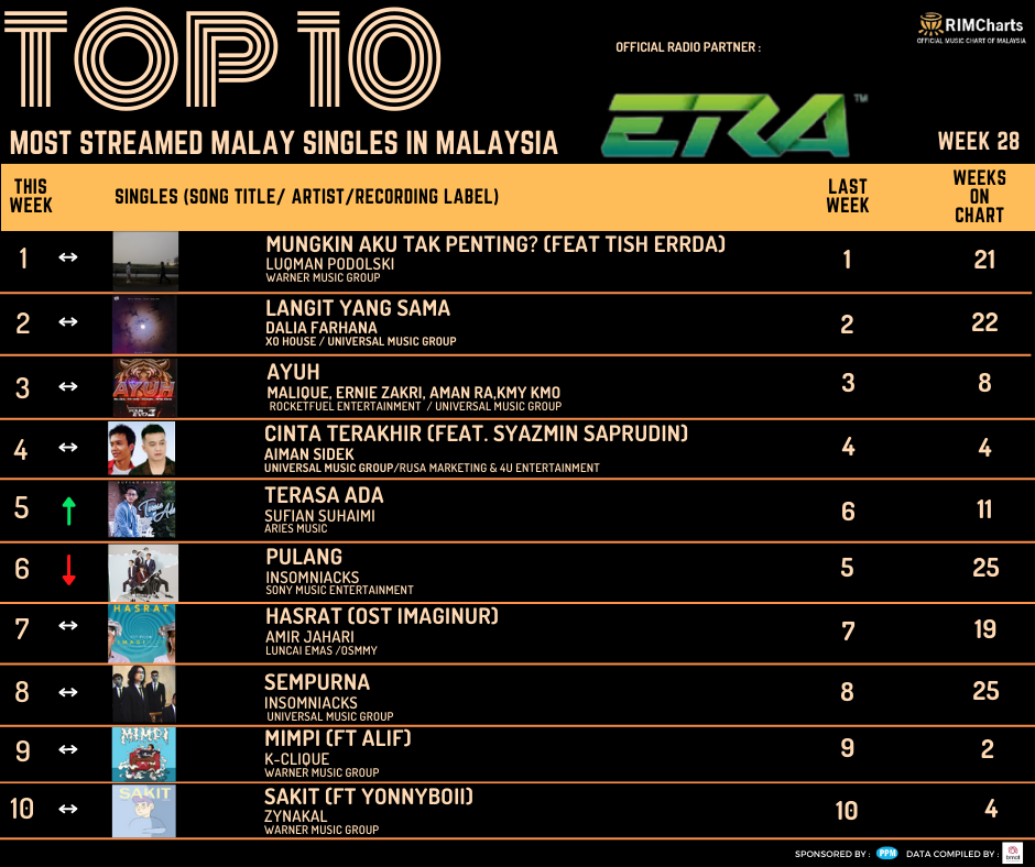 RIM Charts TOP 10 Most Streamed Domestic Singles in Malaysia-Week 28 (07/07/2023- 13/07/2023)