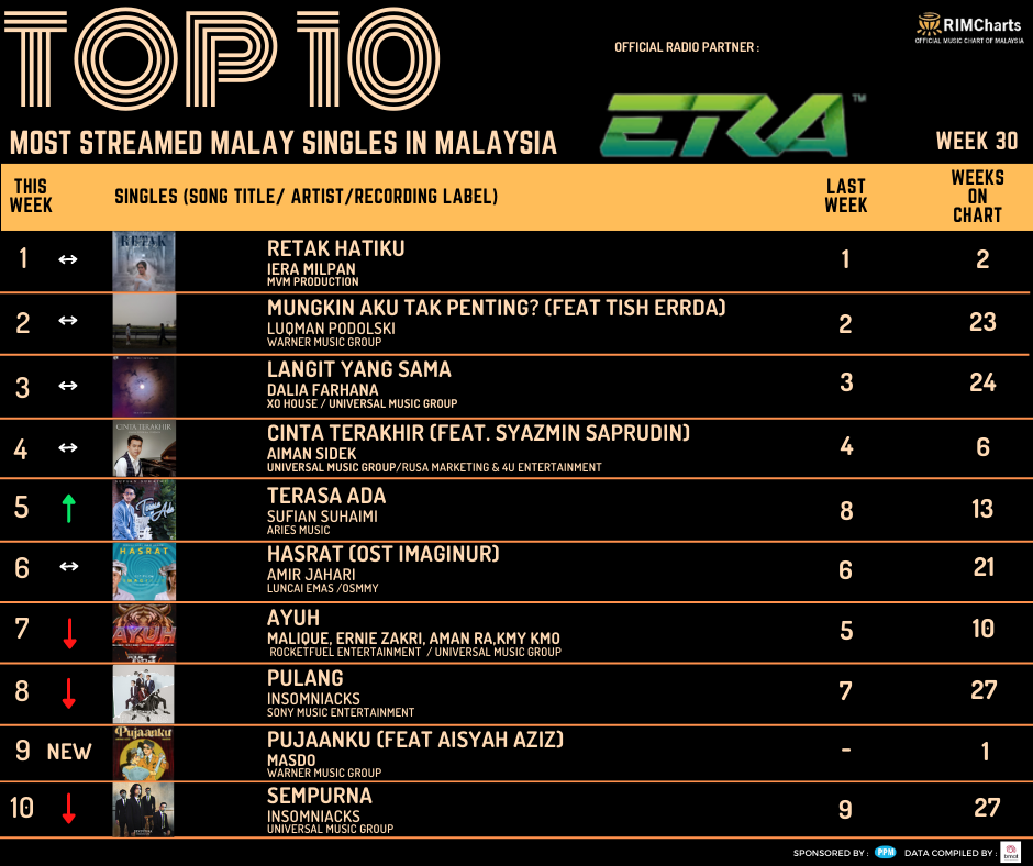 RIM Charts TOP 10 Most Streamed Domestic Singles in Malaysia-Week 30 (21/07/2023- 27/07/2023)