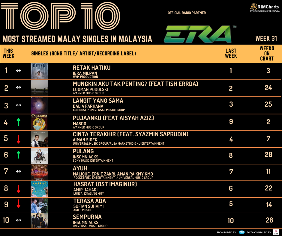 RIM Charts TOP 10 Most Streamed Domestic Singles in Malaysia-Week 31 (28/07/2023- 03/08/2023)