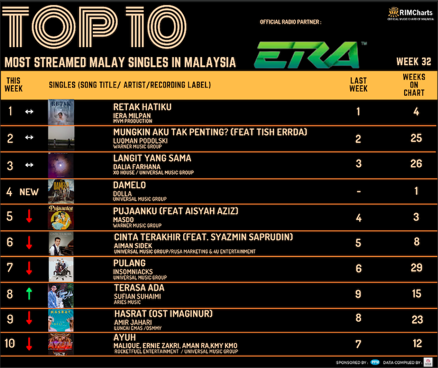 RIM Charts TOP 10 Most Streamed Domestic Singles in Malaysia-Week 32 (04/08/2023- 10/08/2023)