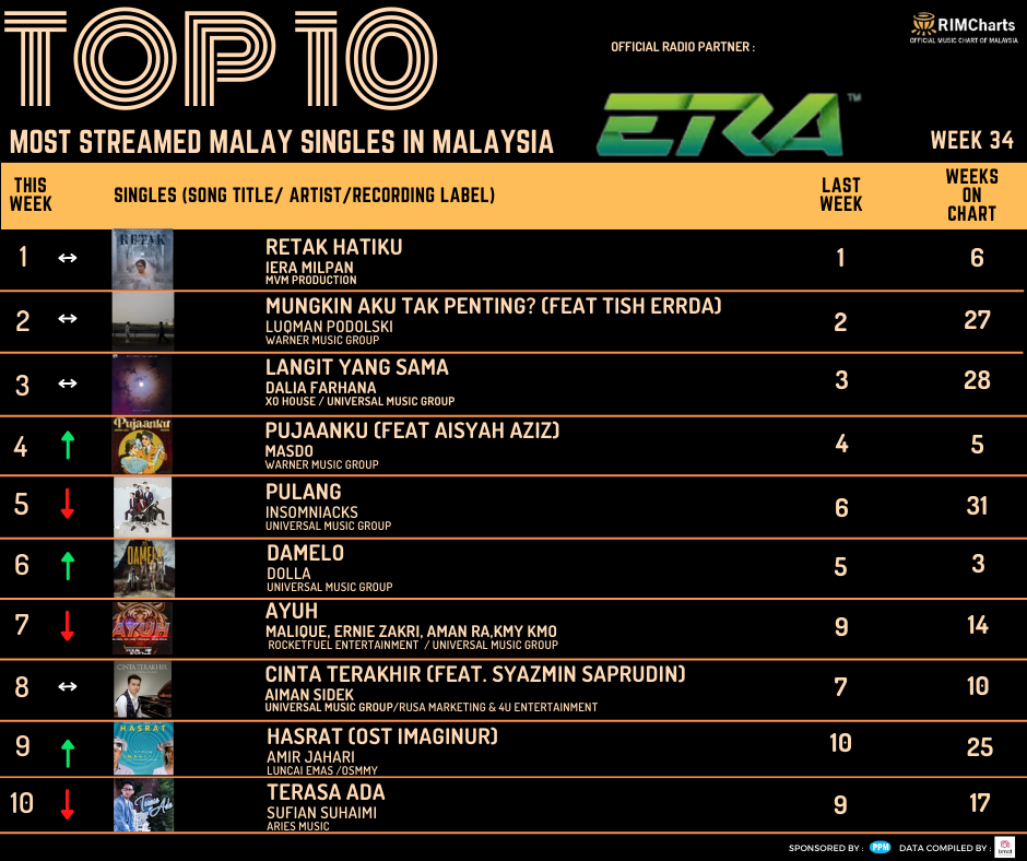RIM Charts TOP 10 Most Streamed Domestic Singles in Malaysia-Week 34 (18/08/2023- 24/08/2023)