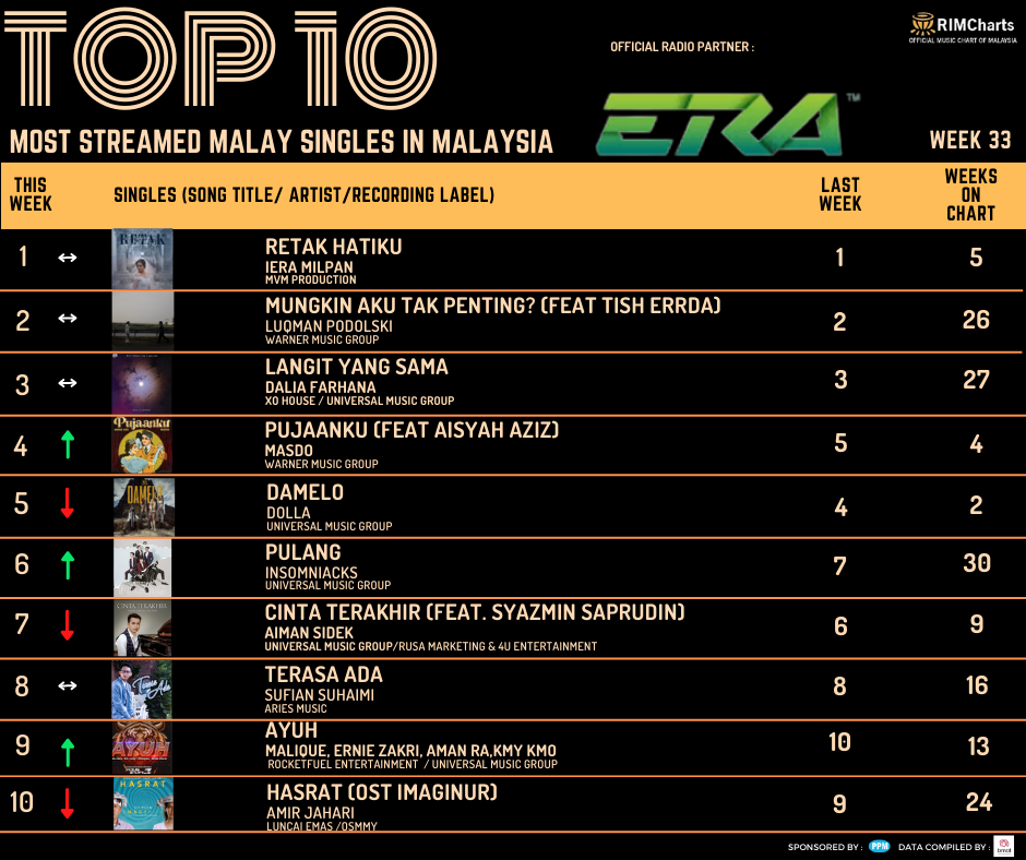 RIM Charts TOP 10 Most Streamed Domestic Singles in Malaysia-Week 33 (11/08/2023- 17/08/2023)