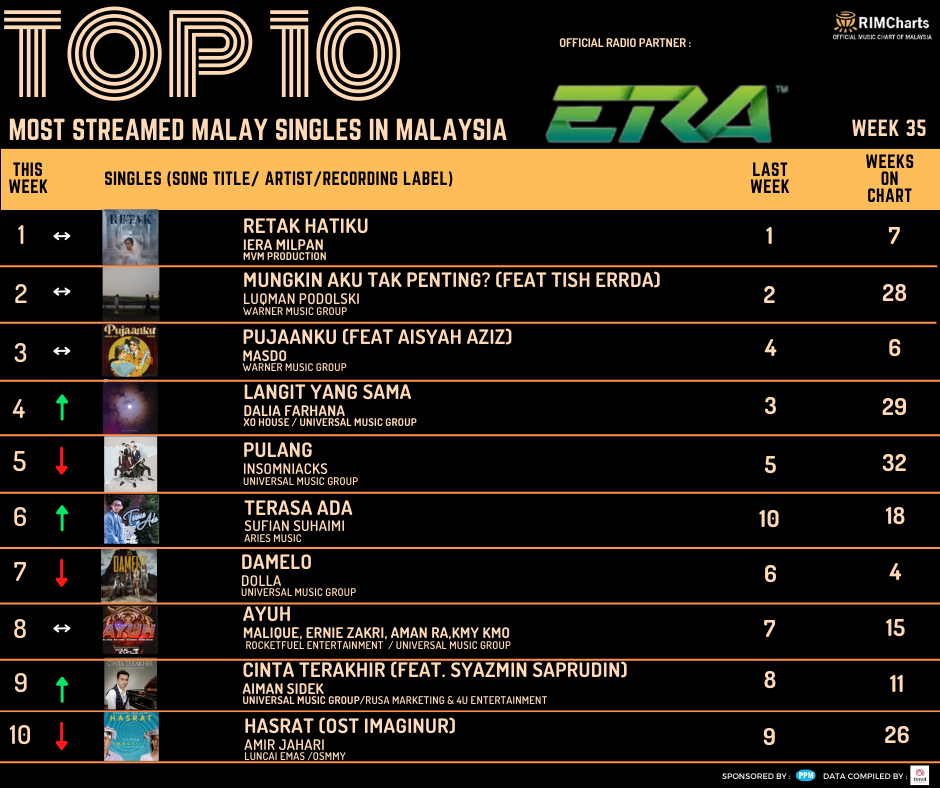 RIM Charts TOP 10 Most Streamed Domestic Singles in Malaysia-Week 35 (25/08/2023- 31/08/2023)