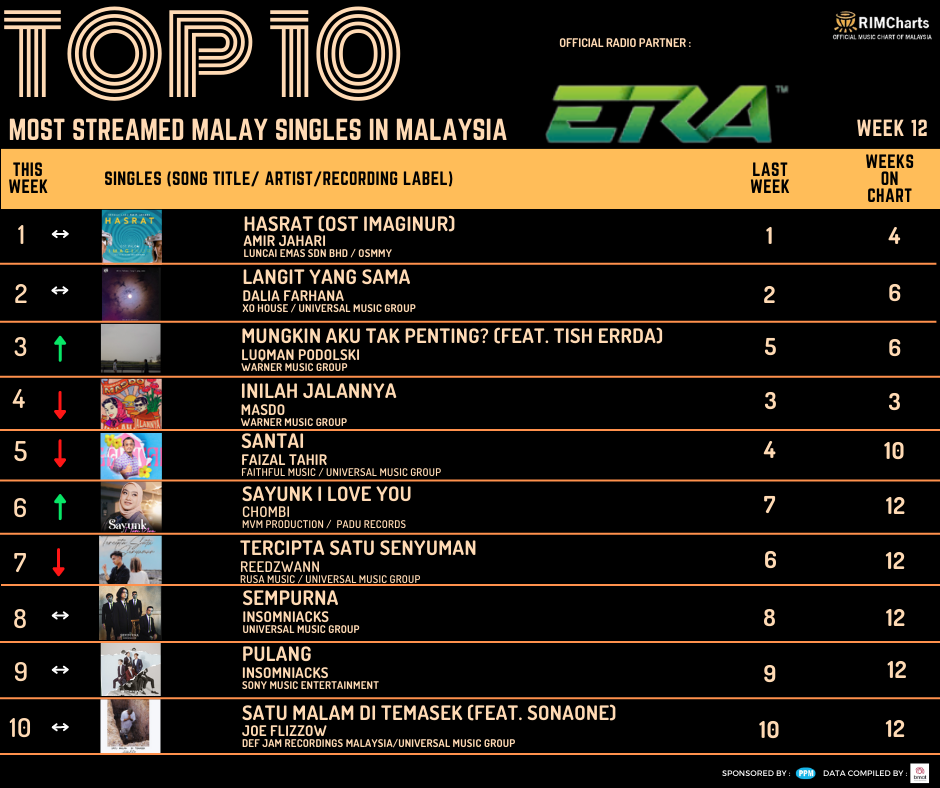 RIM Charts Top 10 Most Streamed Malay Singles in Malaysia-Week 12 (17/03/2023-23/03/2023)