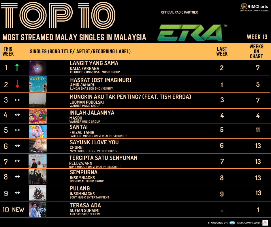 RIM Charts Top 10 Most Streamed Malay Singles in Malaysia-Week 13 (24/03/2023-30/03/2023)