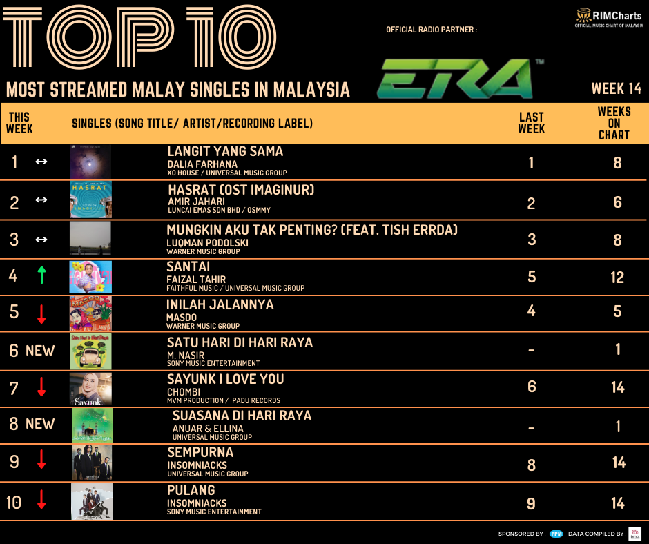 RIM Charts Top 10 Most Streamed Malay Singles in Malaysia-Week 14 (31/03/2023-06/03/2023)