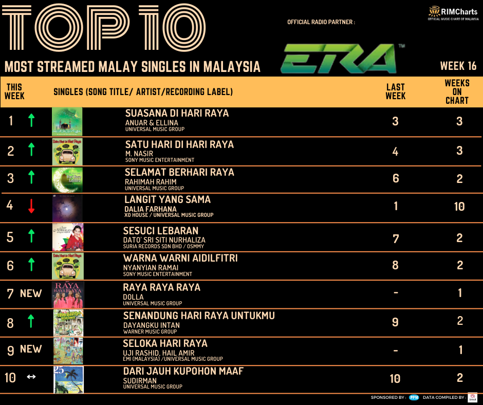 RIM Charts Top 10 Most Streamed Malay Singles in Malaysia-Week 16 (14/04/2023-20/04/2023)
