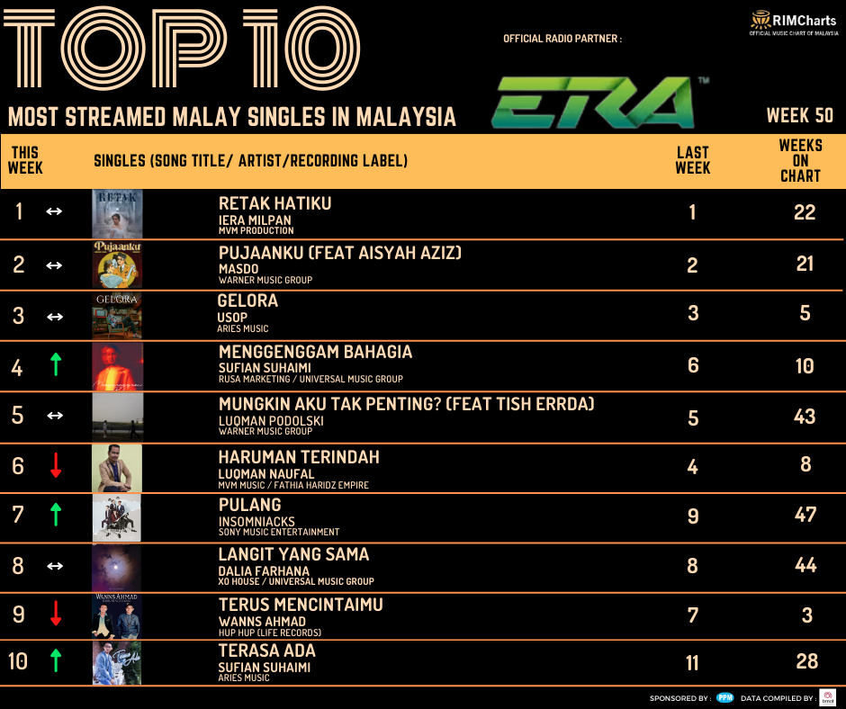 RIM Charts TOP 10 Most Streamed Domestic Singles in Malaysia-Week 51 (15/12/2023-21/12/2023)