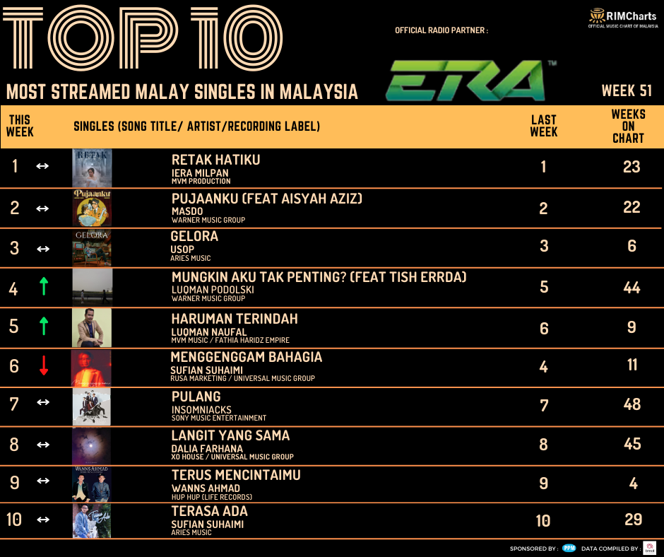 RIM Charts TOP 10 Most Streamed Domestic Singles in Malaysia-Week 51 (15/12/2023-21/12/2023)