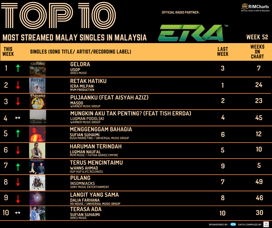 RIM Charts TOP 10 Most Streamed Domestic Singles in Malaysia-Week 52 (22/12/2023-28/12/2023)