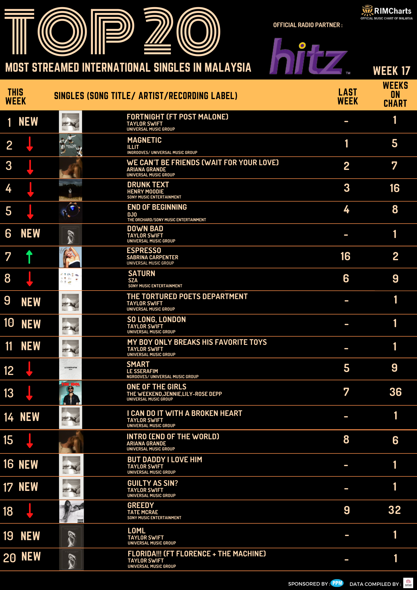 RIM Charts Top 20 Most Streamed International Singles in Malaysia – Week 17 (19/04/2024-25/04/2024)